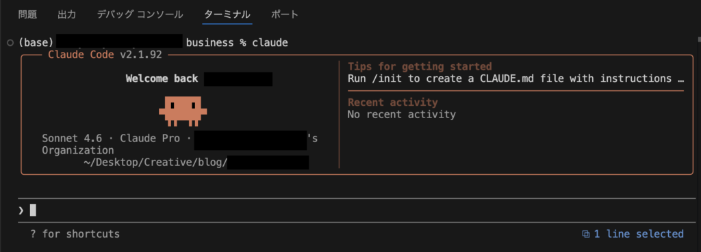 ターミナルで claude と入力してEnterを押すと、Claude Codeが起動します。